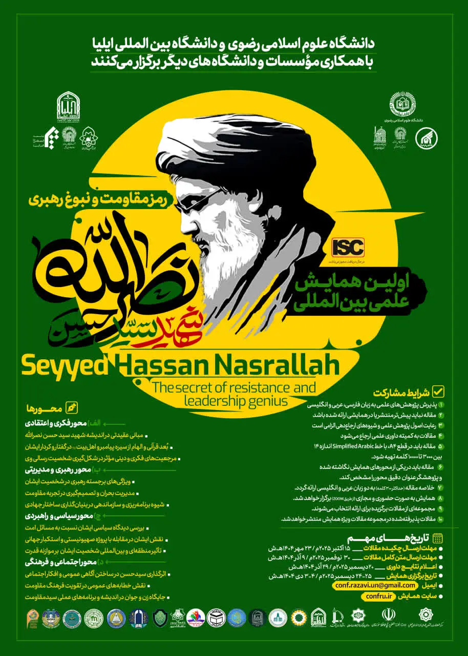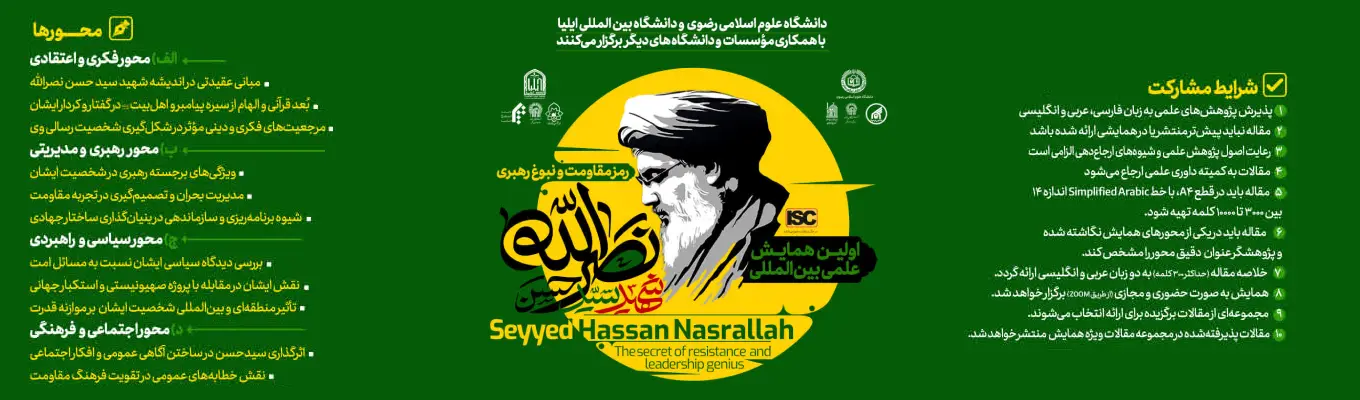 نخستین همایش علمی بینالمللی با عنوان «سید حسن نصرالله؛ رمز مقاومت و نبوغ رهبری» با همکاری دانشگاه علوم اسلامی رضوی و دانشگاه بینالمللی ایلیا (گرجستان) برگزار میشود.