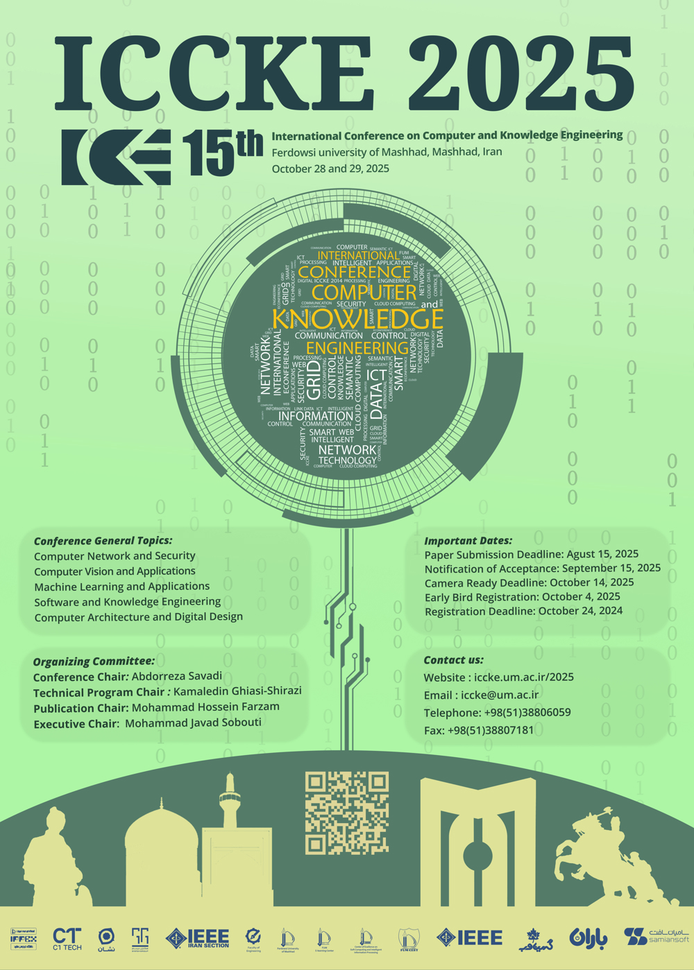 به گزارش پایگاه خبری کنفرانس یاب و به نقل از سایت رسمی کنفرانس، "پانزدهمین کنفرانس بینالمللی کامپیوتر و مهندسی دانش (ICCKE ۲۰۲۵)، آبان ۱۴۰۴" در تاریخ ۶ و ۷ آبان ۱۴۰۴ توسط دانشگاه فردوسی مشهد در شهر مشهد و در محل دانشگاه فردوسی مشهد برگزار می گردد.